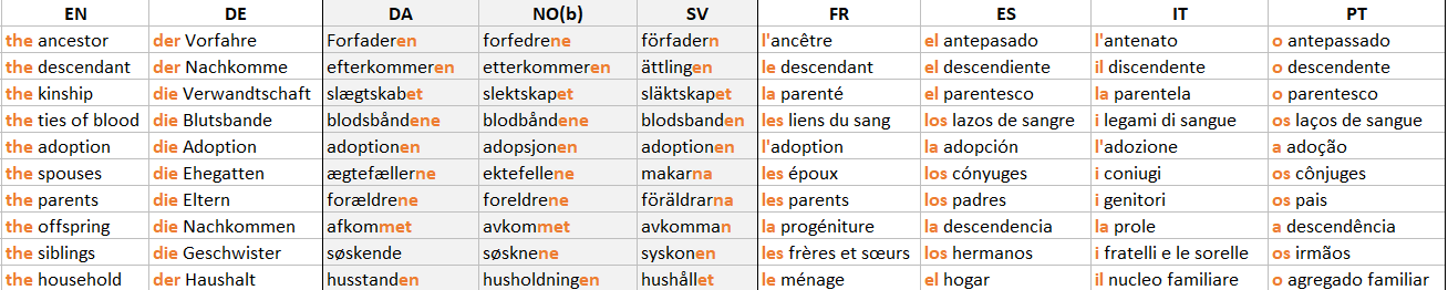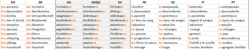 Family is a classic topic of every language learning syllabus. The members of “The Foreign Land’s Explorers” approached it the usual way initially, but they wanted to go further. So, they made a new table with terms related to family, but which were not learned in regular language classes. They built a table, knowing it was just a reference. Each word should not be taken as exact equivalents to the other languages. Once they had the table, they constructed the same sentences in every language, for example: “the spouses become parents and constitute a household with their offspring”.